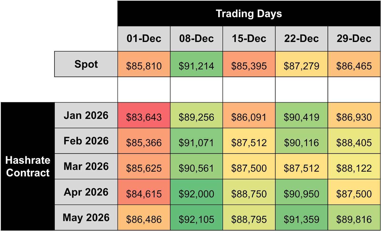 Our analysis of the December 2025 hashrate market focuses on two key points: how the December 2025 hashrate contract traded in previous months and how the forward curve shifted in December, based on pricing for forward hashrate during the month.