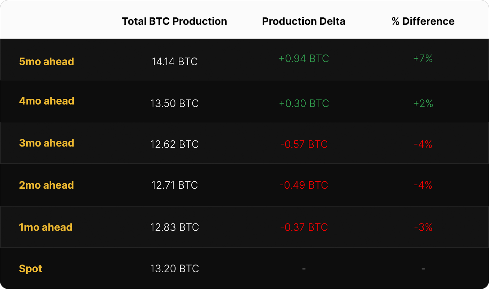 In BTC production terms, early forward sales won, but later hedges lost. Miners who sold December’s hashrate four or more months in advance earned between 2–7% more BTC than spot FPPS miners, with July’s forward sales leading at +7%. Hedges between September–November underperformed by 3–4%.
