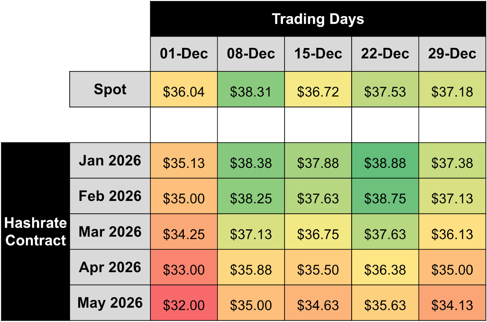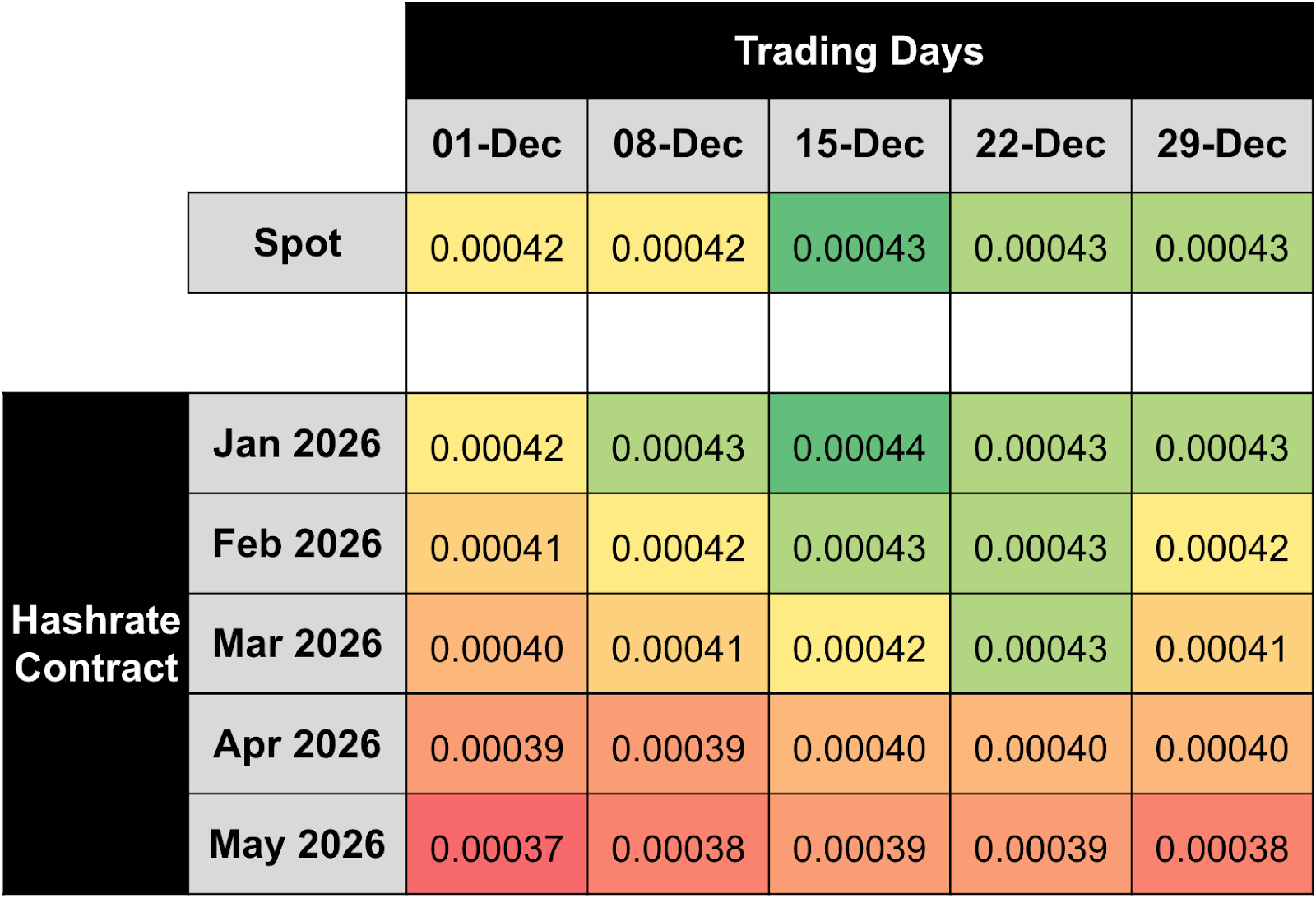 The two tables below summarize the evolution of hashrate forward markets during December 2025, for the subsequent five months from January 2026–May 2026. Rows represent specific monthly hashrate contracts, while columns represent specific trading days. Cell values indicate the average daily mid-market price, except for spot prices.
