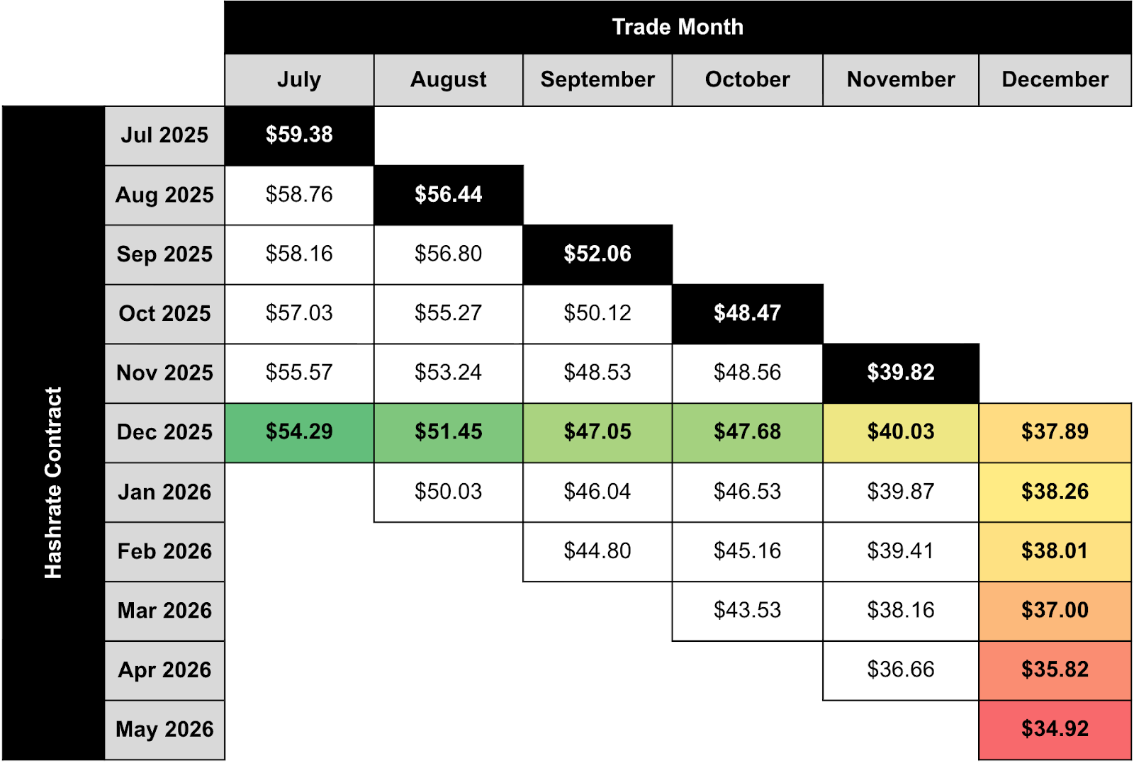 Note: all values (except for the bold highlighted main diagonal) shown in figures represent mid-market rates, the midpoint of the best bid and ask on Luxor's Non-Deliverable Hashrate Forward market. The bold highlighted main diagonal shows actual spot hashprice settlement in each month, measured by Luxor’s Bitcoin Hashprice Index.