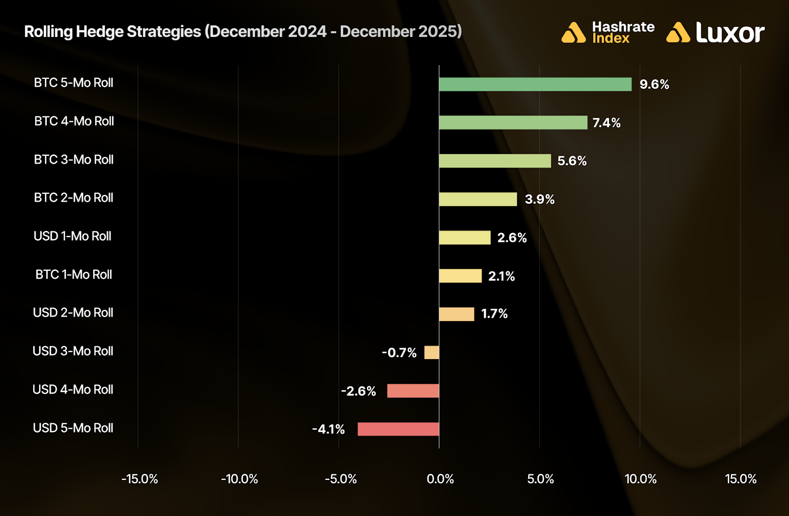 This comparison reveals that rolling BTC-denominated hedging strategies outperformed over the past year, with the strongest results coming from 5-month (+9.6%) and 4-month forward sales (+7.4%). These longer-duration contracts generally benefited from locking in a higher hashprice ahead of rising network difficulty and low fee environments.
