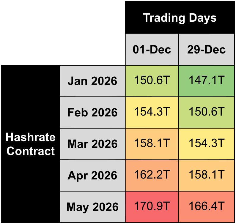 Based on this analysis, we estimate that future difficulty and hashrate expectations fell during the month of December, by ~2.5% for the January 2026–May 2026 contracts.