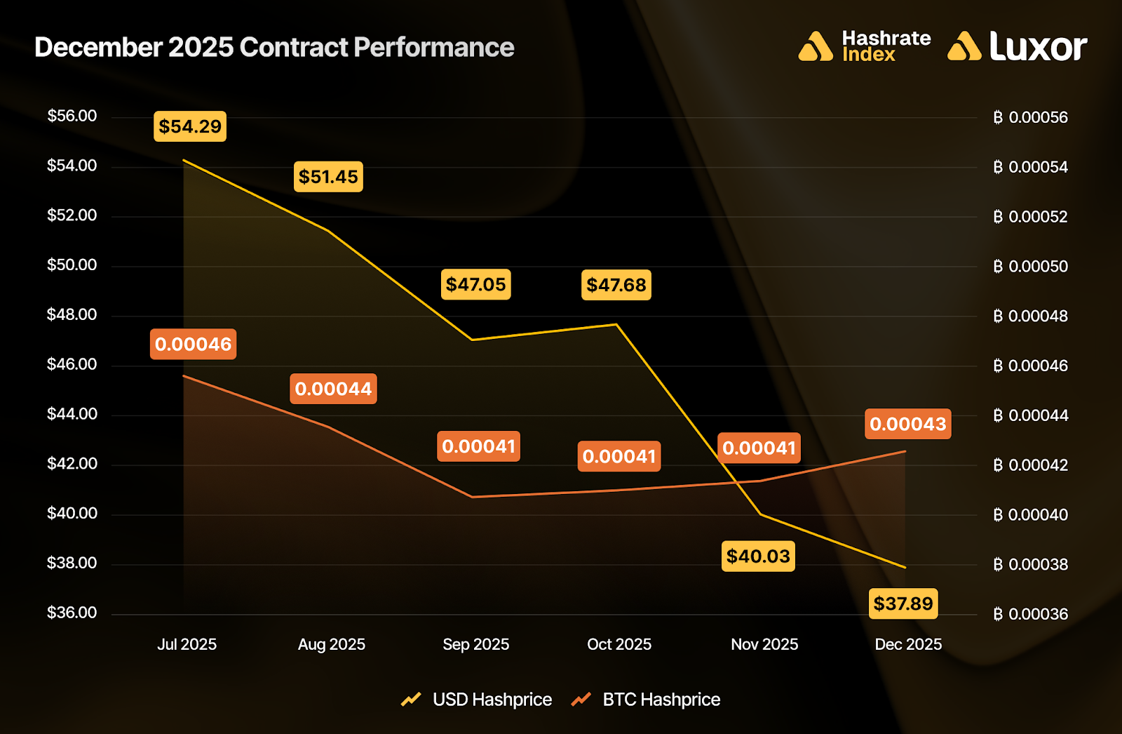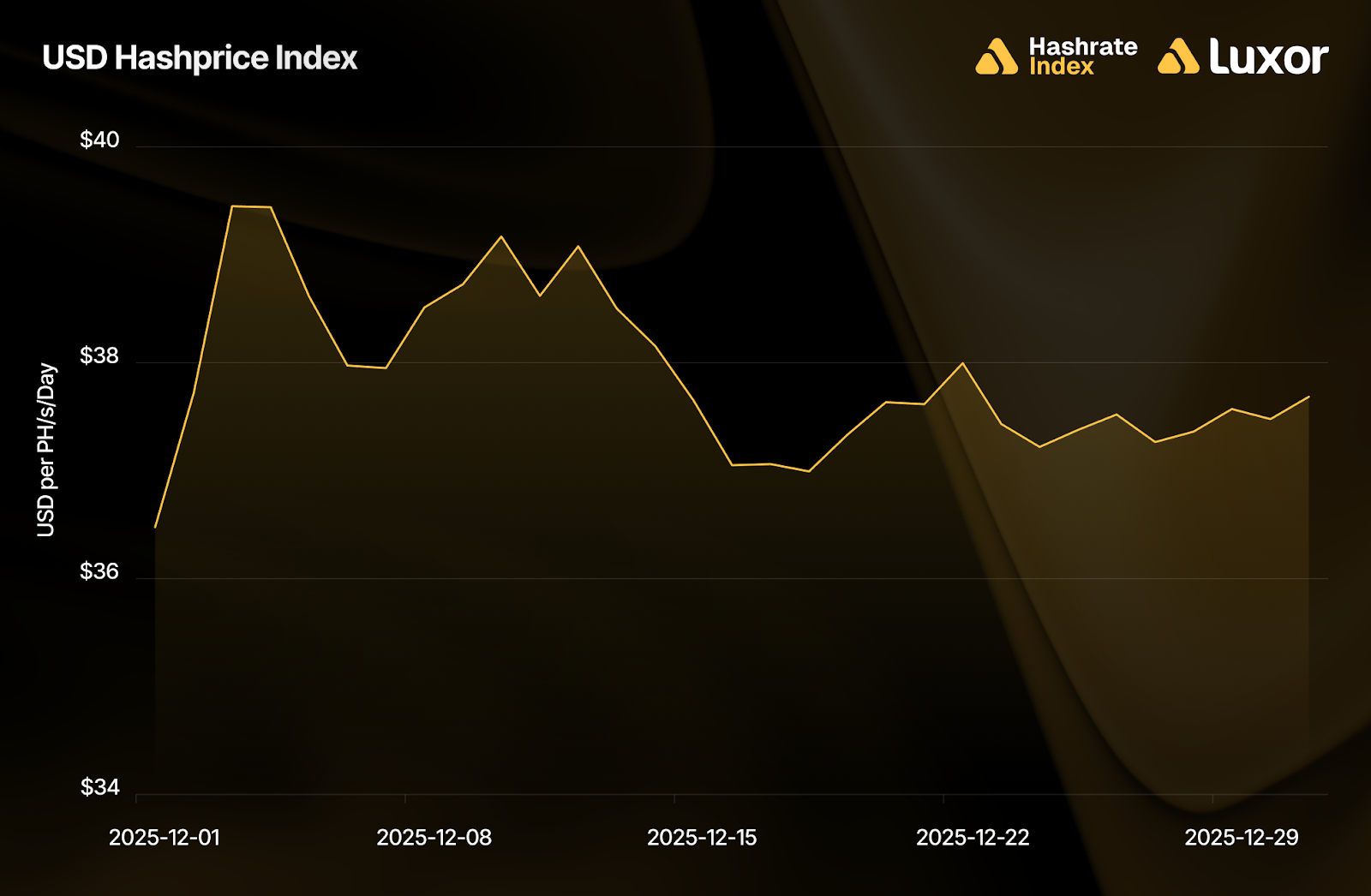 Despite the weak monthly average, hashprice stabilized and drifted modestly higher over the course of December: it opened at $36.48, traded in a tight $36.48–$39.45 range, and closed at $37.68 per PH/s/day.