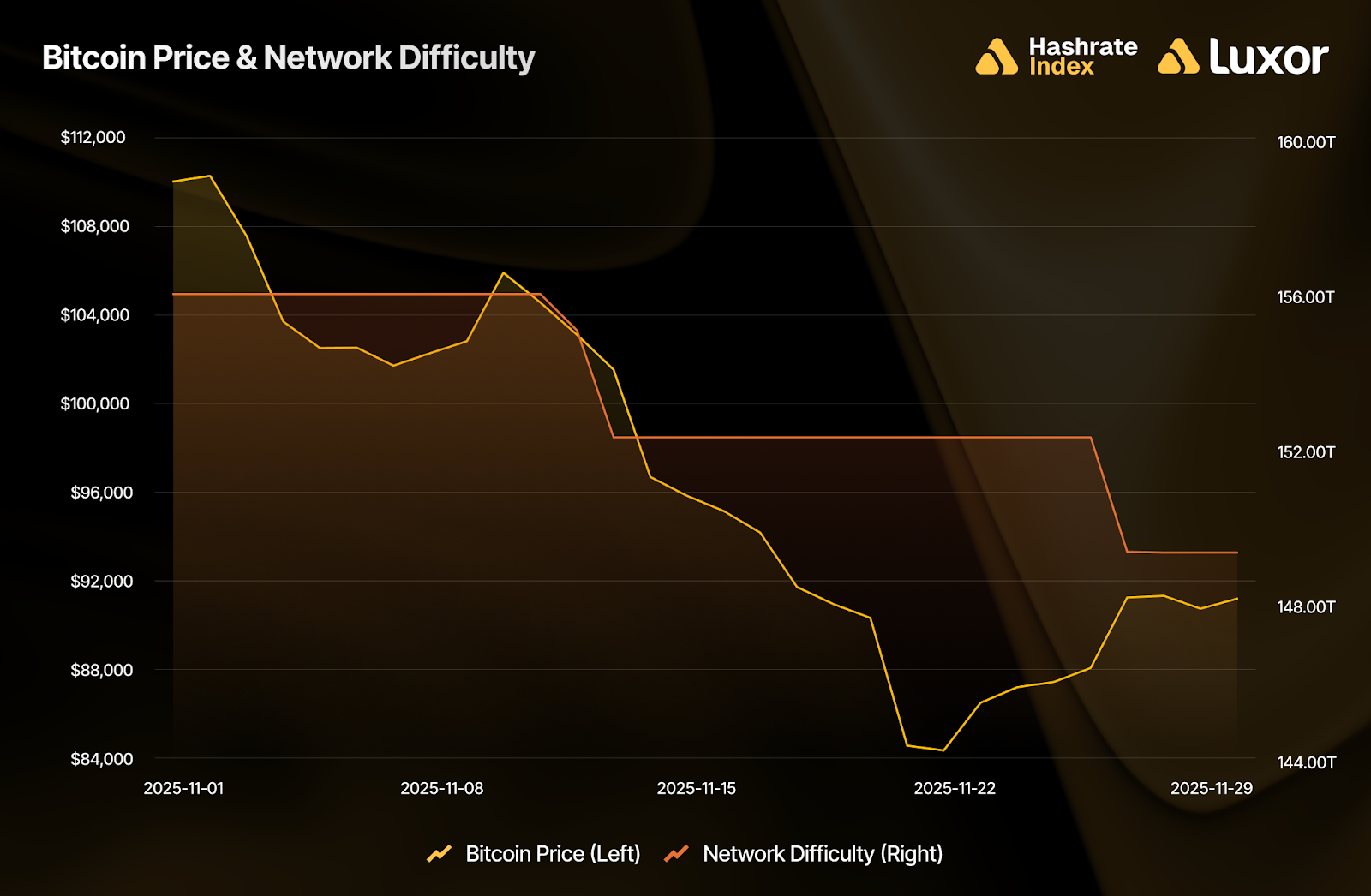 - Hashprice Dips Into The Deep End: USD hashprice averaged $39.82 (-17.9%), hitting a new all-time low of $35.06 on November 22. BTC hashprice averaged 0.00041 BTC (-2.7%), cushioned slightly by downward difficulty adjustments on November 12 (-2.37%) and November 26 (-1.95%).