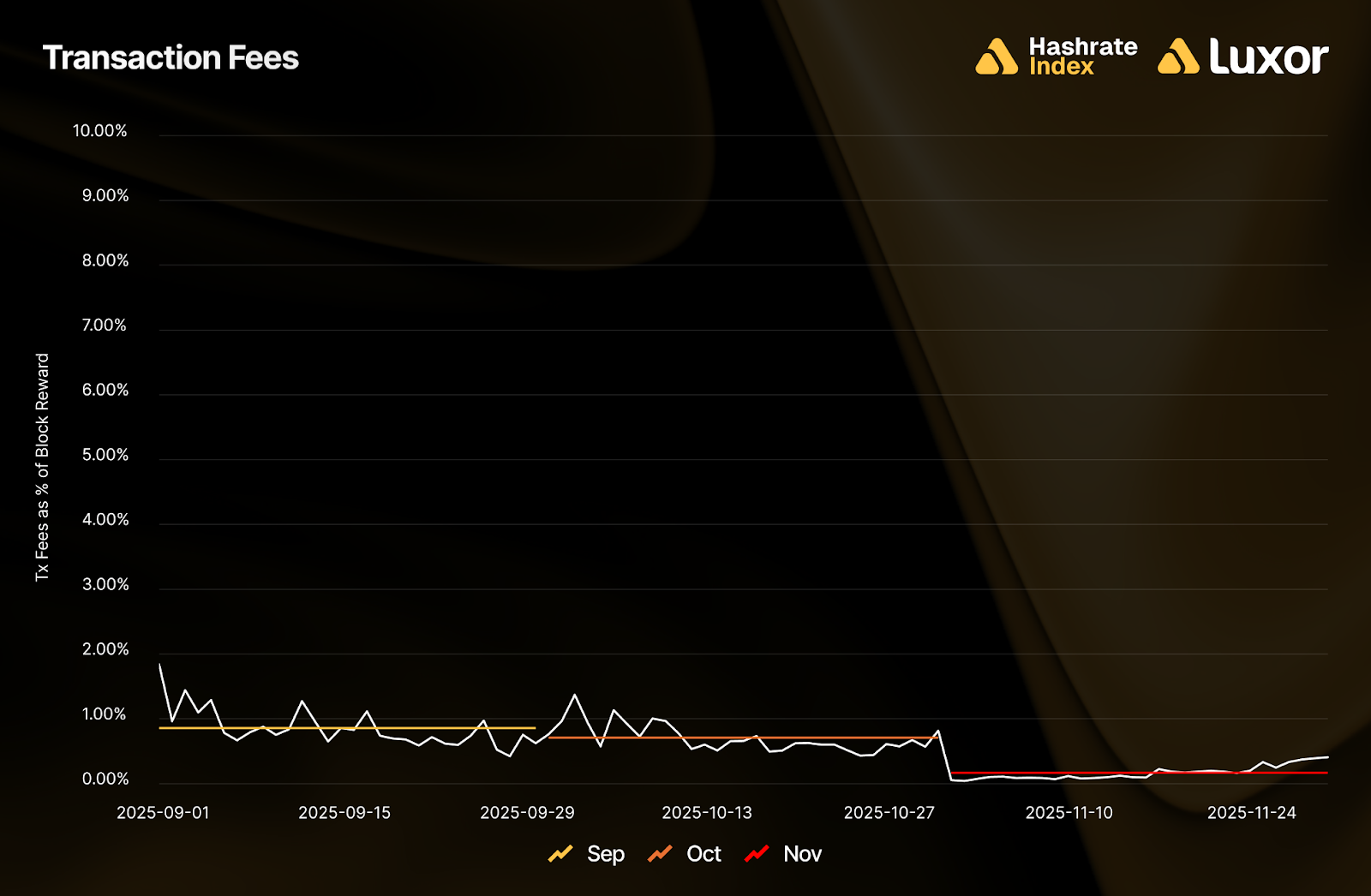 Note: figures assume 0.022 BTC per block transaction fee collection on November 3 and 0.020 BTC per block on December 1, 2025.