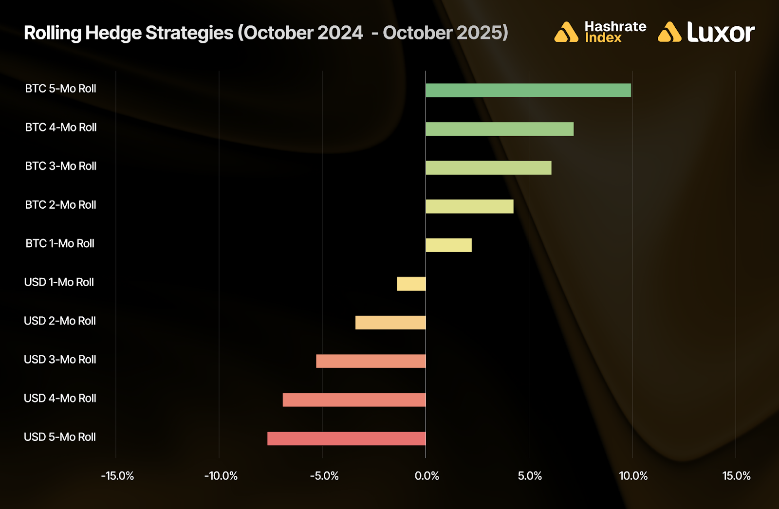 Zooming out, the following chart shows the performance for a range of rolling hedge strategies relative to spot FPPS mining, segmented by contract denomination and hedge horizon over the past year, from October 2024 – October 2025: