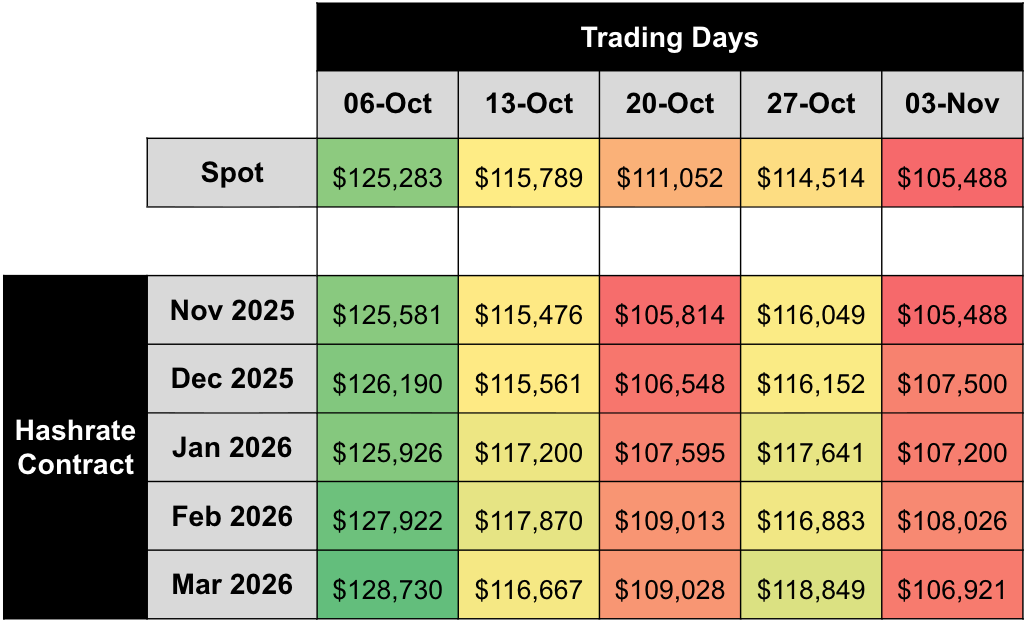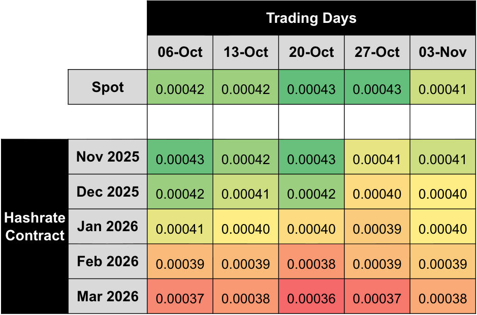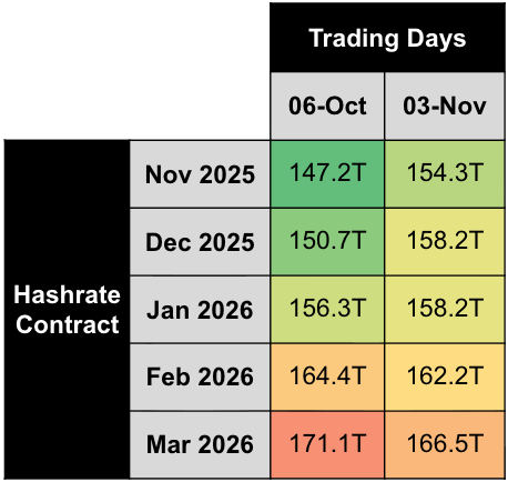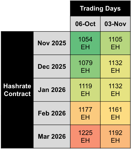 Based on this simple analysis, we estimate that future hashrate expectations were mixed during the month of October, rising by ~1–5% for the November 2025 – January 2026 contracts, but falling by ~1–3% for the February 2026 – March 2026 contracts.