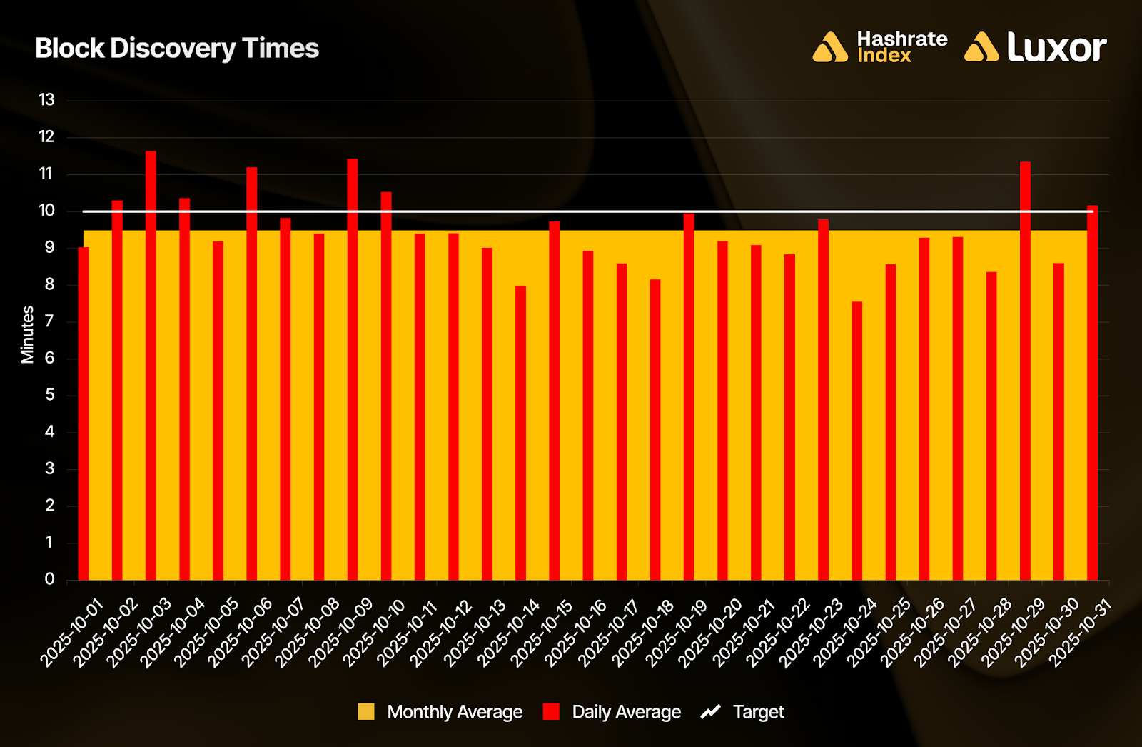 October’s fast blocks at 9m30s seconds implies that miners were running ~5.3% more hashrate than the network targeted. In other words: miners deployed machines, improved uptime & efficiency, and/or curtailed less, which triggered upward difficulty adjustments as aggregate SHA-256 computing power increased.