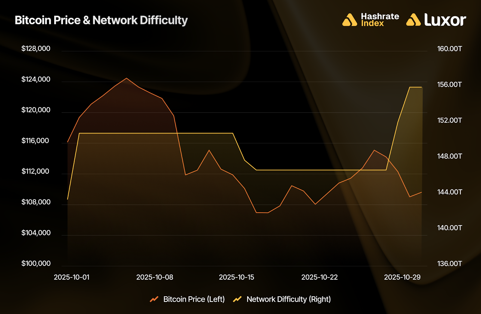 - Uptober 2025 Cancelled: Bitcoin briefly hit a new all-time high of $124,485 on October 6 before reversing to close the month down at $109,610. Meanwhile, network difficulty surged (+8.4%) to a record 155.97T as block times averaged 9m30s.