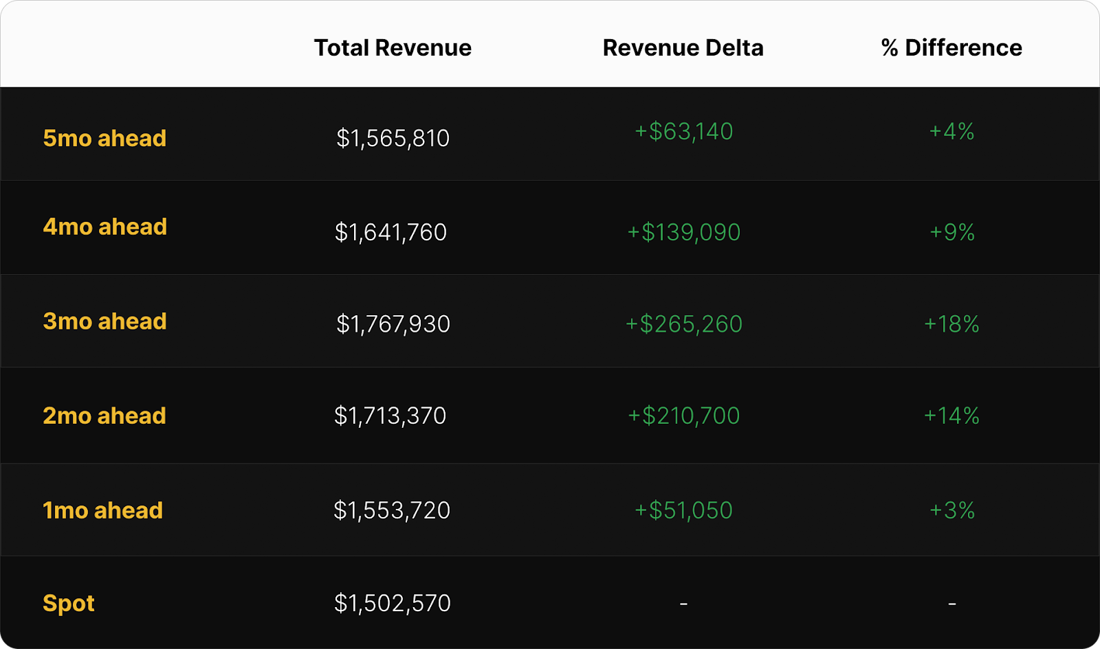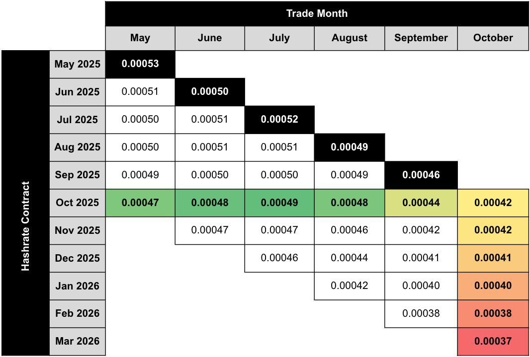 Note: all values (except for the bold highlighted main diagonal) shown in figures represent mid-market rates, the midpoint of the best bid and ask on Luxor's Non-Deliverable Hashrate Forward market. The bold highlighted main diagonal shows actual spot hashprice settlement in each month, measured by Luxor’s Bitcoin Hashprice Index.