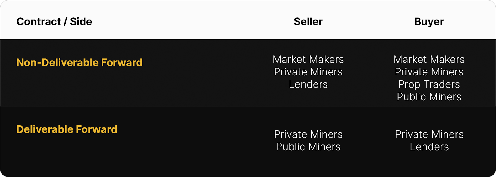 The table below shows the type of market participants on the buy and sell side of Luxor’s deliverable (DF) and non-deliverable hashrate forward (NDF) market. In October, lenders were active on the buy side of the DF market, while public and private miners used the contract to sell forward, receive financing, and expand their fleet.