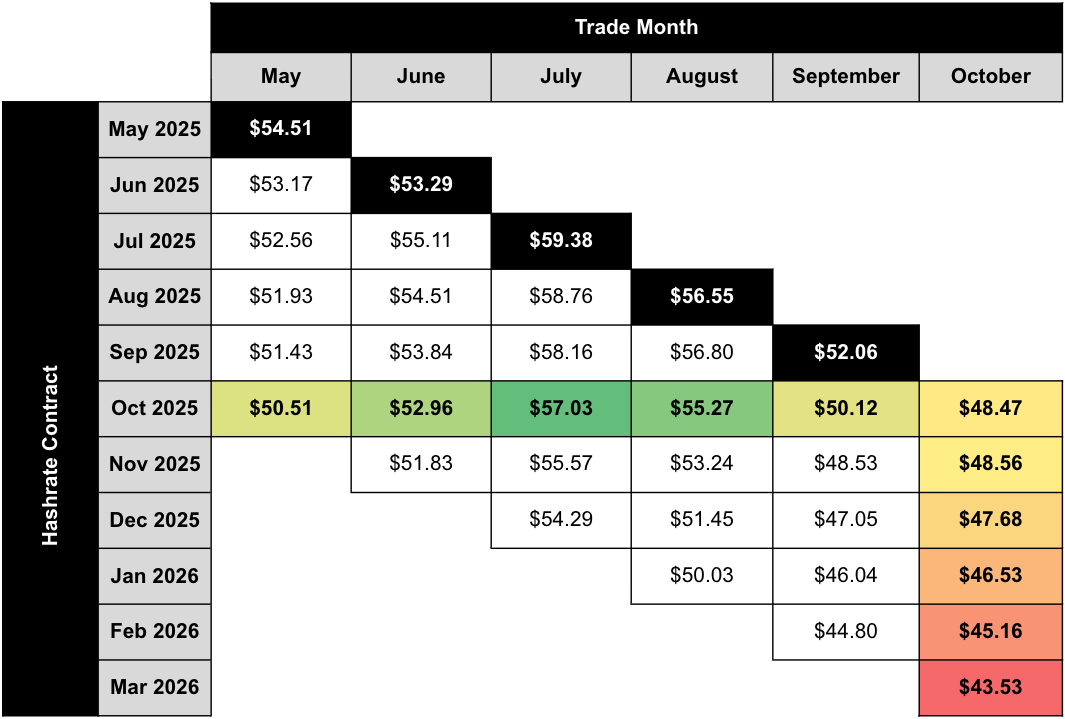 Our analysis of the October 2025 hashrate market focuses on two key points: how the October 2025 hashrate contract traded in previous months and how the forward curve shifted in October, based on pricing for forward hashrate during the month.