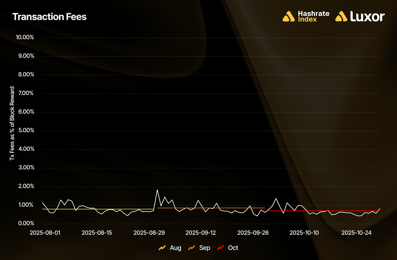 Network difficulty continued to climb in October, breaking new ground. Following a positive adjustment on October 1 (+5.97%), difficulty increased to 150.84T, an all-time high at the time. A negative adjustment followed on October 16 (-2.73%), marking the first difficulty decrease since July 2025, before being met with another positive adjustment on October 29 (+6.31%), which increased difficulty to 155.97T, a new and current all-time high. The monthly average for difficulty experienced by operators came in at 149.28T (versus 135.75T in September) — an 8.4% increase, and the strongest monthly growth in average difficulty seen since November 2024 (+9.7%).