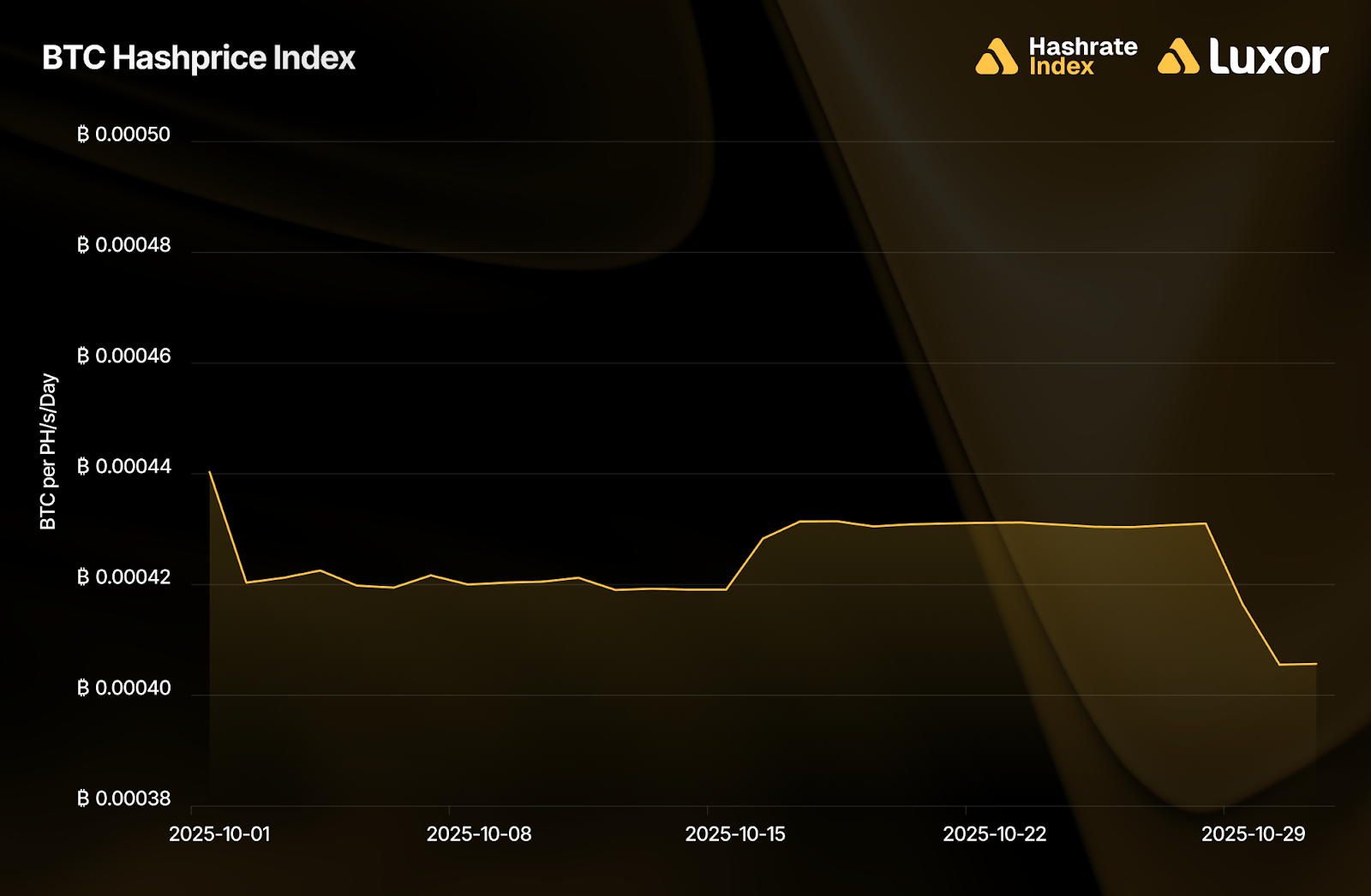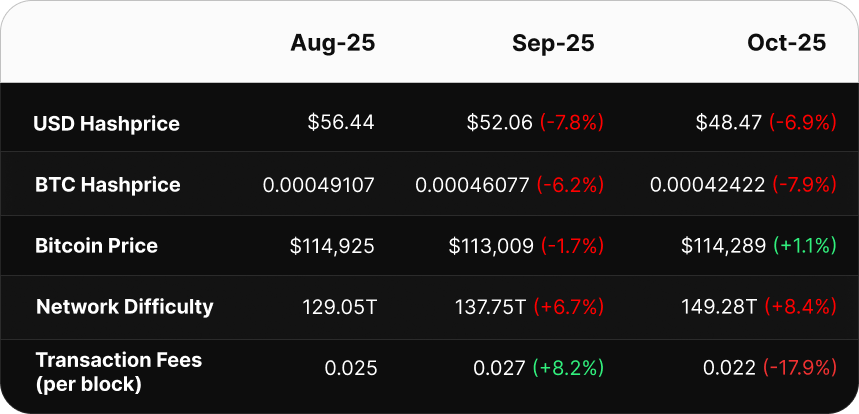BTC-denominated hashprice mostly reflected network difficulty adjustments in October. It began at 0.00044 BTC per PH/s/Day and trailed down toward 0.00041 BTC following the two positive difficulty adjustments on October 1 and October 29. The negative adjustment on October 16 provided momentary relief, but overall BTC hashprice averaged 0.00042 BTC per PH/s/Day, declining 7.9% month-over-month.