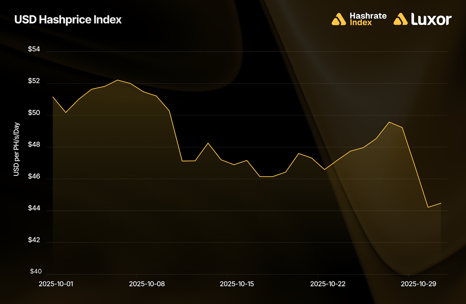 USD hashprice started October at $51.16 per PH/s/Day and trended up to $52.22 over the first week, before trailing down toward $44.47 by month-end. It ranged between $44.21 – $52.22 and came out to a monthly average of $48.47, a 6.9% decline month-over-month.
