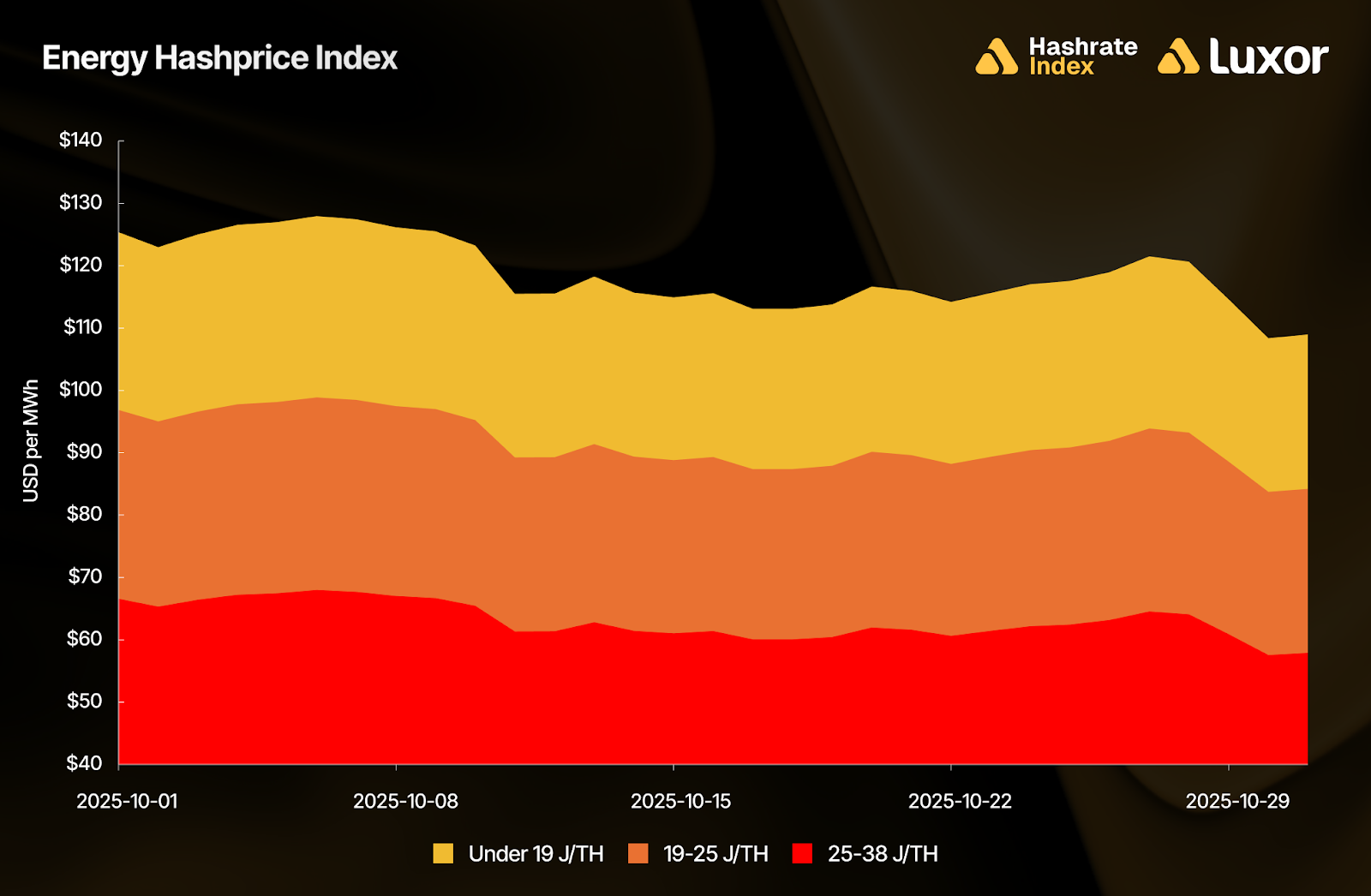 In October, operations with sub-19 J/TH fleets earned approximately $119 per MWh in mining revenues, whereas miners in the 19-25 J/TH tier earned $92 per MWh and the 25-38 J/TH tier earned $63 per MWh, respectively. Since new-generation fleets enable wider operating margins, there is a strong incentive for miners to continue deploying these machines from a compute revenue-per-watt perspective, which continues to result in network hashrate growth.