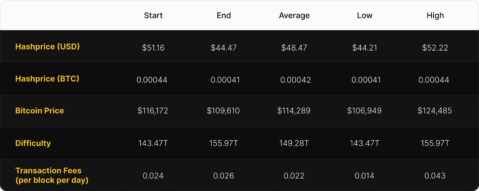 - Hashprice Declines for Third Straight Month: Average USD hashprice fell (-6.9%) to $48.47 per PH/s/Day, while BTC hashprice declined (-7.9%) to 0.00042 BTC.