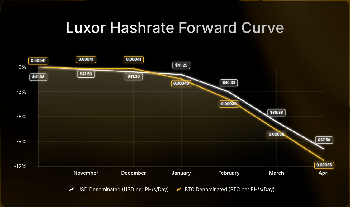 Looking forward, Luxor’s Hashrate Forward Market is pricing in an average hashprice of $40.15 or 0.00039 BTC per PH/s/Day over the next six months. Sellers can currently secure this hashprice while buyers have the opportunity to lock in the same hashcost through April 2026.