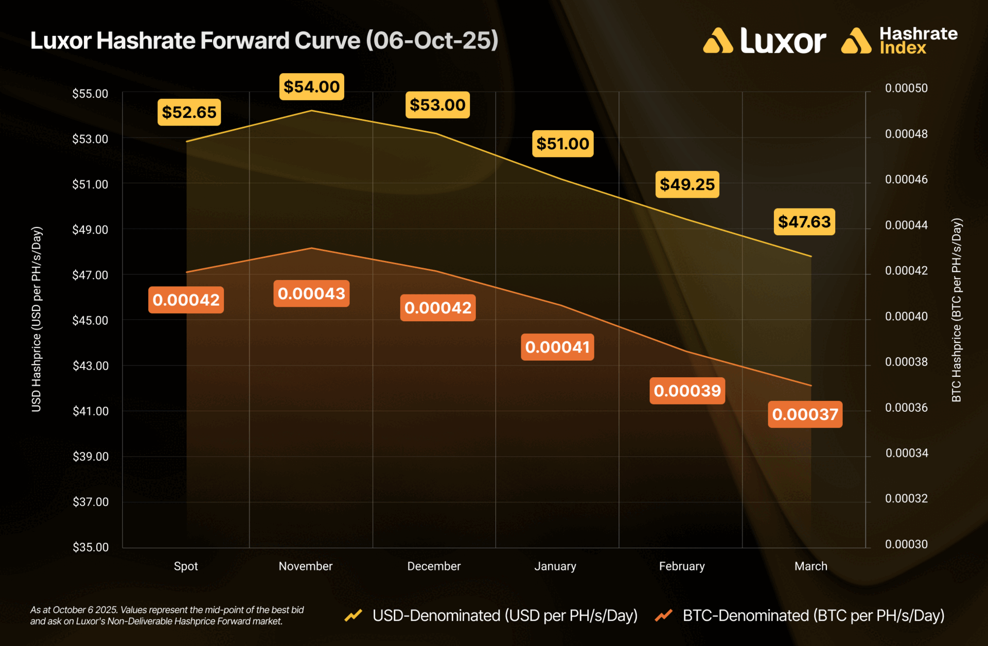 In both USD and BTC terms, October 2025 favored sellers across the board. As hashprice fell through the month, forward sellers outperformed spot mining (FPPS) across all intervals. USD contracts cleared between $50.12–$57.03 per PH/s/Day versus a $48.47 settlement, while BTC contracts traded between 0.00044 BTC – 0.00047 BTC versus 0.00042 BTC spot.