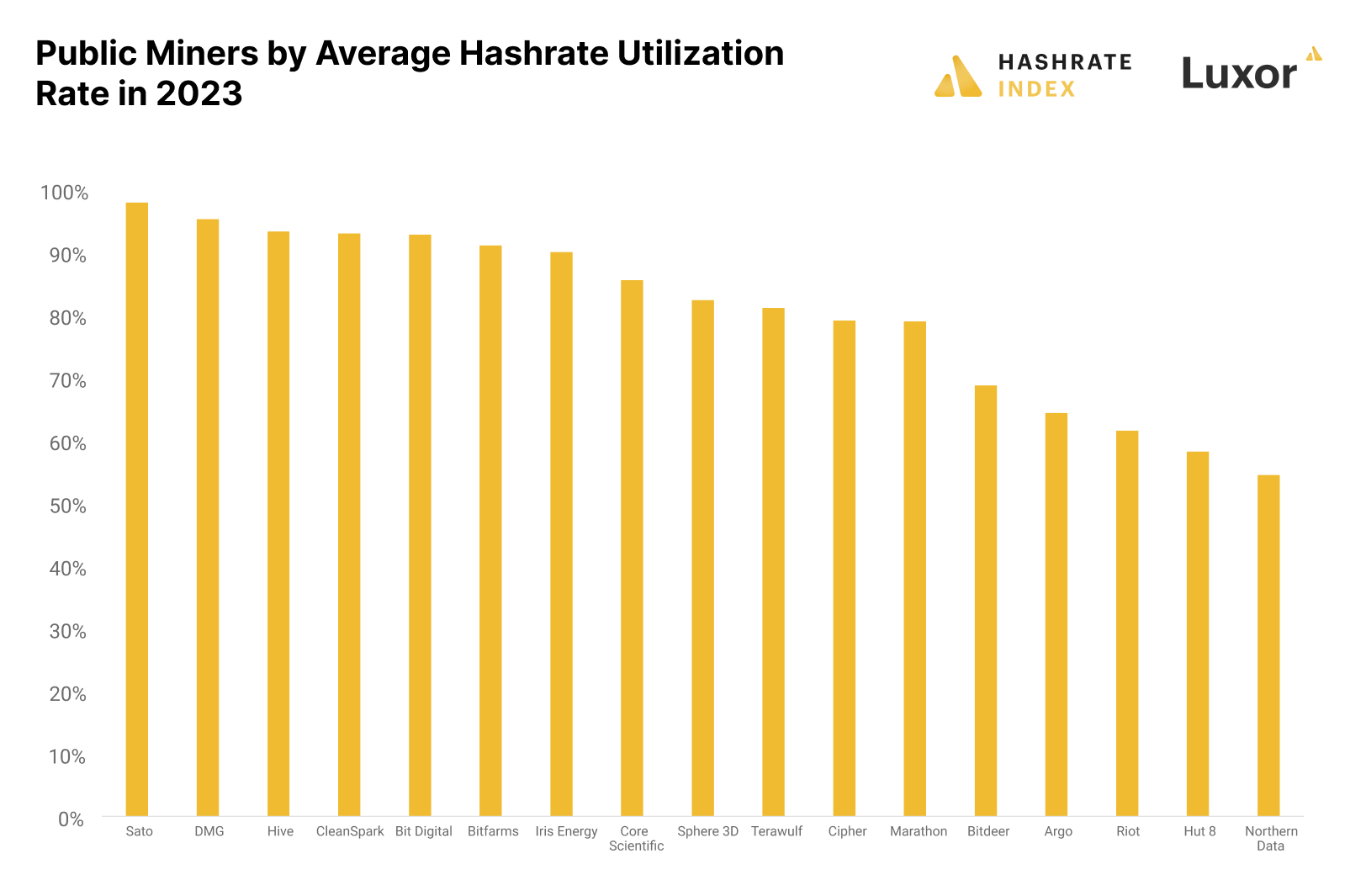 The chart below reveals that a handful of public miners’ hashrate utilization rates in 2023 are below 70%, while others score above 90%. As proved in the chart above, the miners with the highest hashrate utilization rates will pay back the ASICs the fastest and achieve the highest return on invested capital, all else equal.