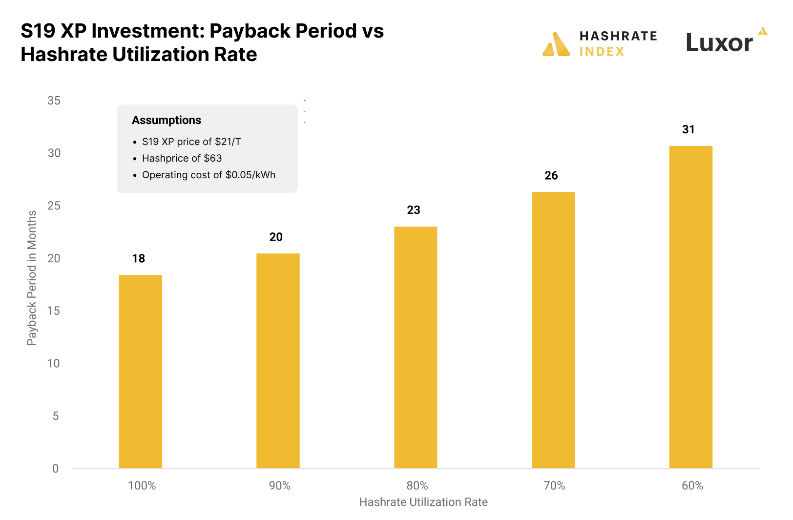 As you can see on the chart above, the payback period of an ASIC investment differs tremendously based on the hashrate utilization rate. The payback period is only 18 months at a 100% hashrate utilization rate while increasing to 31 months at a 60% hashrate utilization rate. Miners should aim for ASIC payback periods of less than 18 months, given the short-lived nature of these assets.