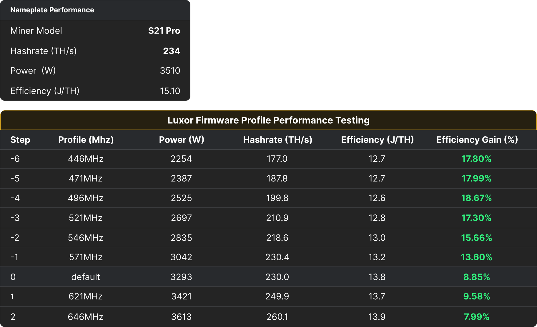 The S21 Pro’s nameplate performance boasts a hashrate of 234 TH/s, consuming 3510W at an efficiency of 15.10 J/TH. However, Luxor’s firmware optimizations provide a range of operating modes that can significantly improve efficiency.