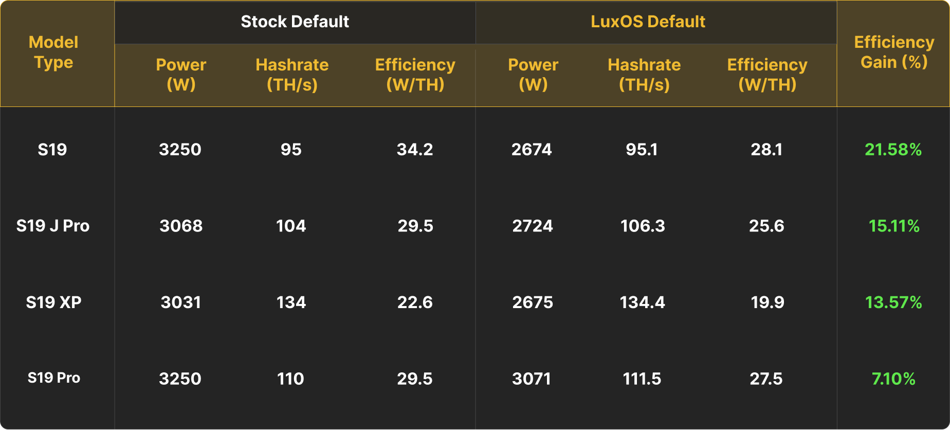 S19 95 T (Vanilla) achieves a 21.58% efficiency gain, dropping from 34.2 W/TH to 28.1 W/TH; the S19 J Pro improves by 15.11%, from 29.5 W/TH to 25.6 W/TH; the S19 XP sees a 13.57% gain, reducing from 22.6 W/TH to 19.9 W/TH; and the S19 Pro gains 7.10%, improving from 29.5 W/TH to 27.5 W/TH.