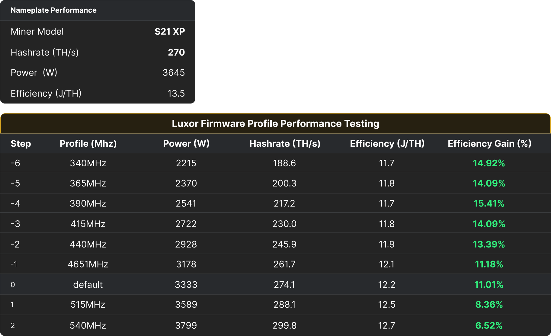 By default, LuxOS offers 24 profiles to choose from, including the ability to create additional custom profiles tailored to your specific needs. Both tables below showcase nine different profiles, spanning from steps -6 to +2. We’ve highlighted these nine profiles as a ‘safe zone’ — a recommended range for conducting your operations. However, if you decide to venture beyond this safe zone, please exercise caution and remain attentive to your equipment and testing conditions.