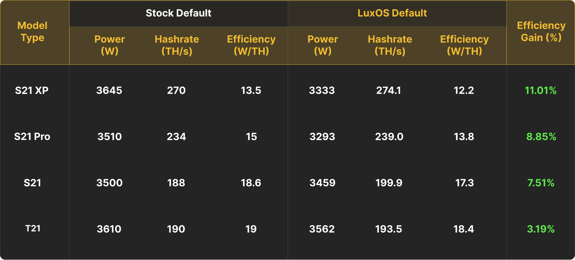 LuxOS Increases efficiency by over 18% on the S21 Pro and 15% on the S21 XP.