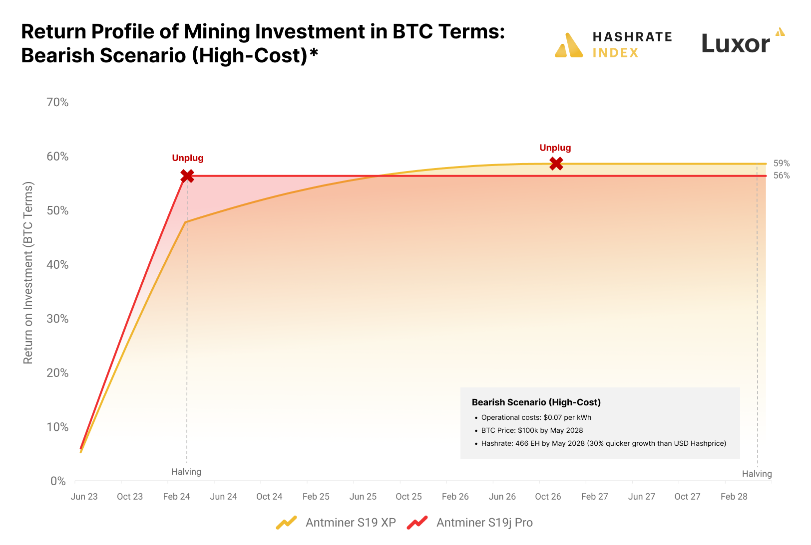 Like in our bearish scenario, an investment in the S19 XP also performs significantly worse, only giving a return of 75%.