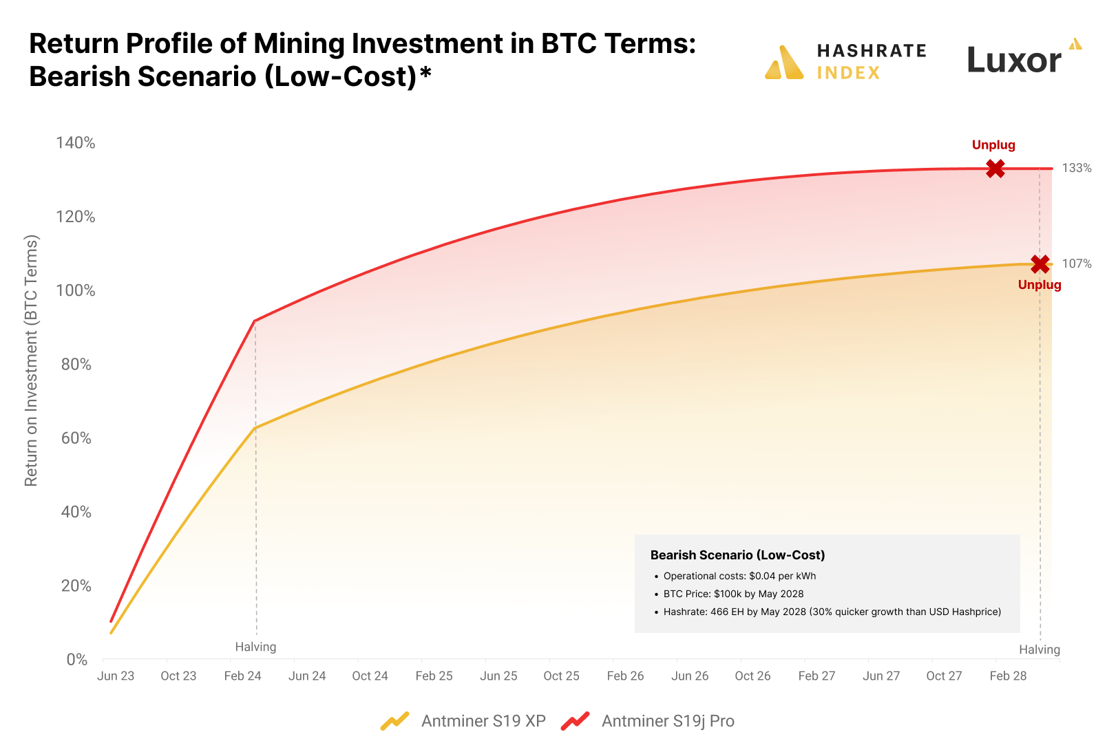 Things are looking much better for the low-cost miner. The S19j Pro and the S19 XP could remain cash flow positive until the halving in 2028 at $0.04 per kWh if they don’t fail before then. The S19j Pro gives a total bitcoin-denominated ROI of 148%, a decent yield on a five-year bitcoin investment.