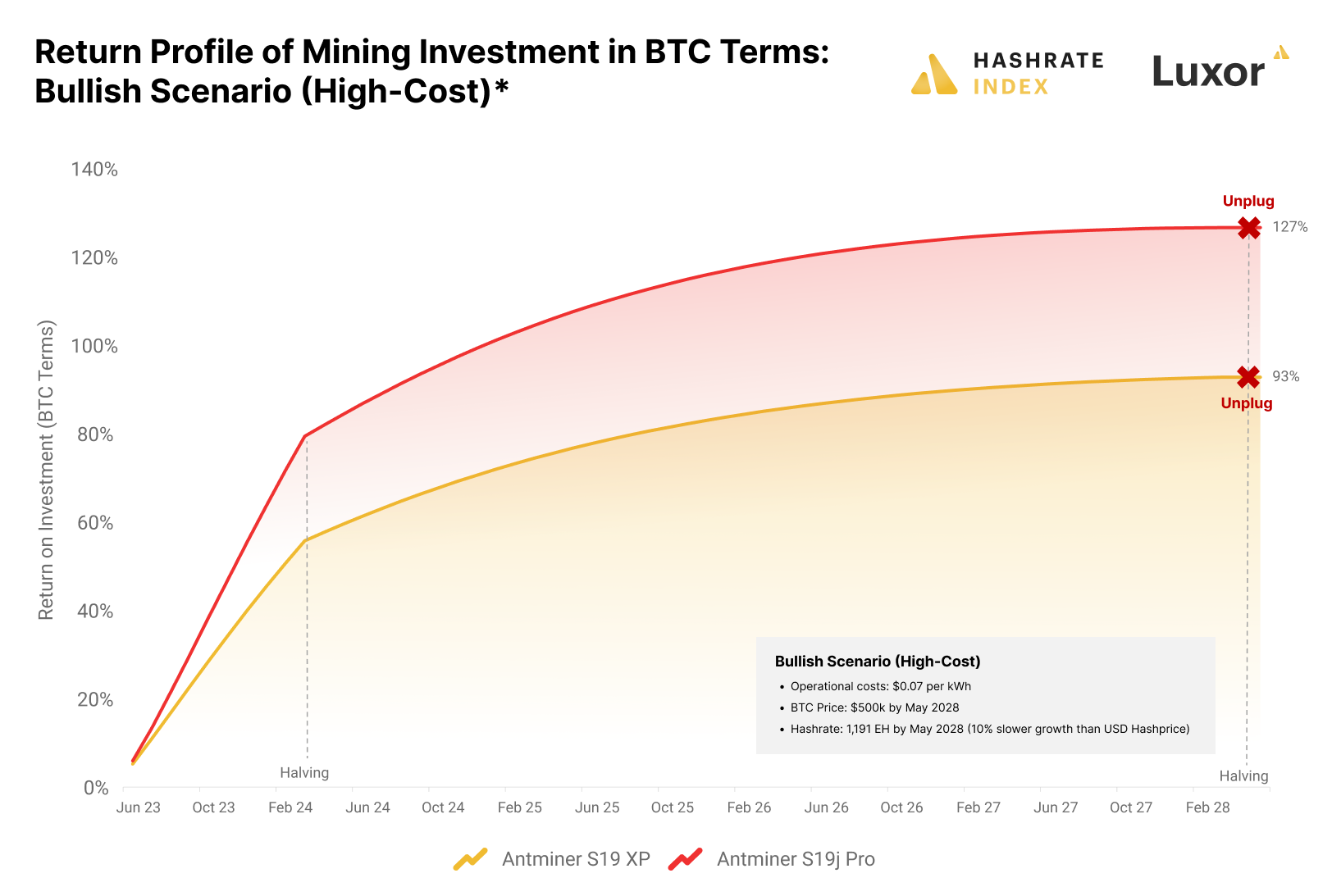 As usual, an investment in the more expensive S19 XP falls short, with a total ROI of 93% over the five-year horizon. Interestingly, even in such a bullish scenario, it would be better off simply buying bitcoin over buying an S19 XP. This machine trades at a significant premium to the less-efficient S19j Pro, and is, according to this analysis, overpriced.