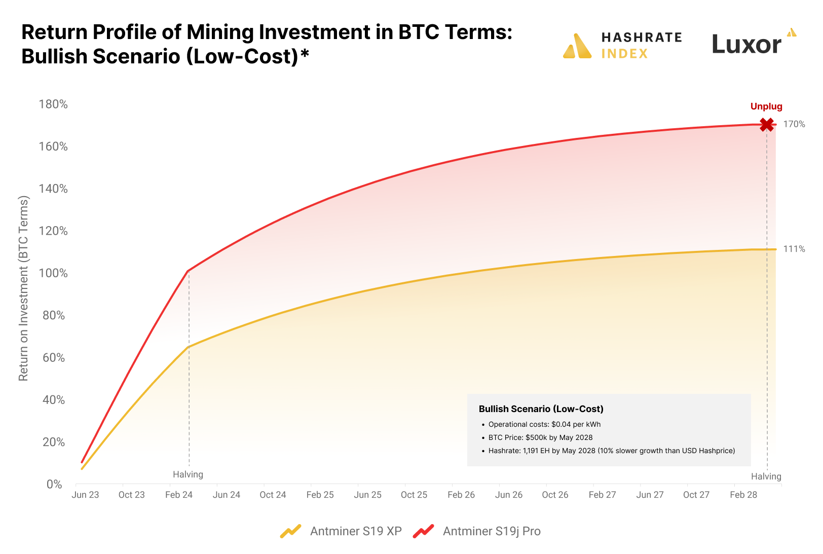 Here comes the juicy stuff. In our bullish scenario, a miner with only $0.04 per kWh operational costs will make a 170% bitcoin-denominated ROI by investing in the S19j Pro. Even if the machine is scrapped before the halving in 2028, it will likely recoup at least 150% of the bitcoin investment. The investor has thus turned his initial 1 BTC investment into 1.5 BTC in just a few years - pretty good.