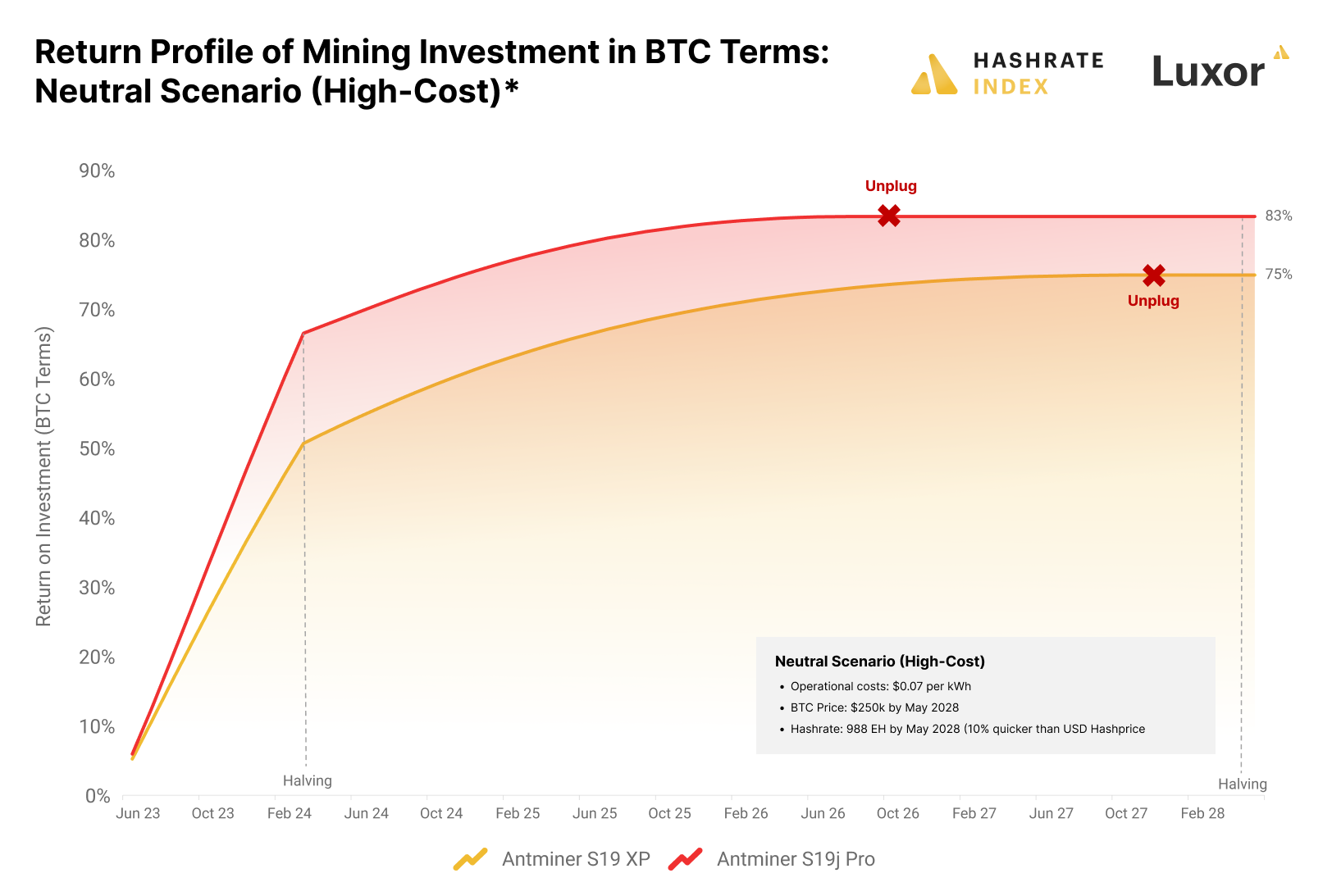 The methodology is simple. A miner purchases mining rigs based on current pricing from the Luxor RFQ Platform and plugs them in from June 1st. I calculate the bitcoin-denominated return of the investment, assuming the miner holds all the bitcoin except for the hosting fee payment. If the return of this investment exceeds 100%, the miner has recouped the bitcoin he initially spent on machines, and the investment is considered a success.