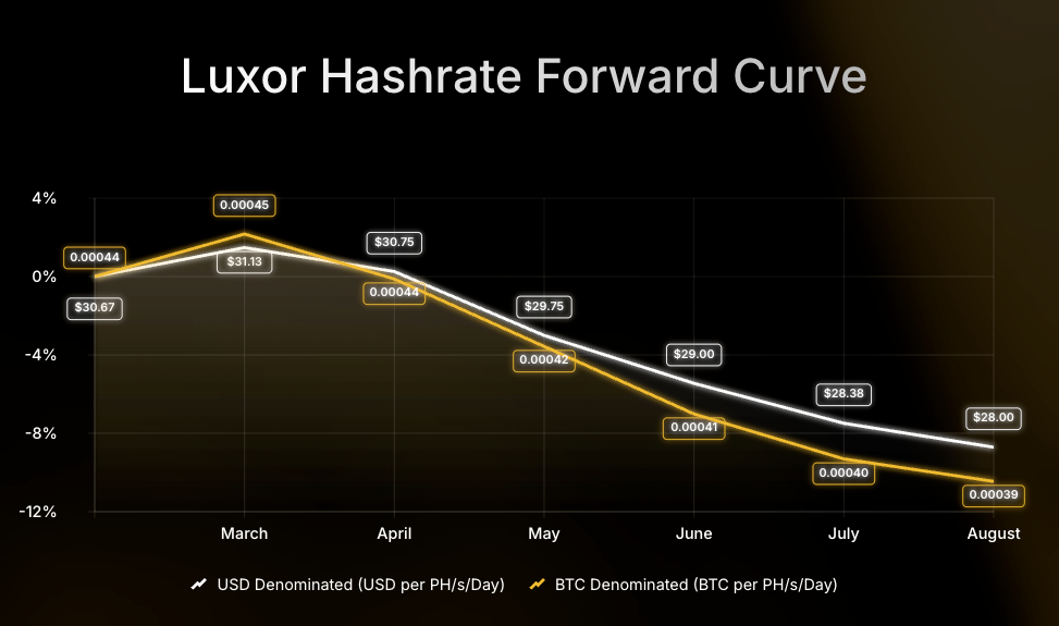 Luxor’s Hashrate Forward Market is pricing in an average hashprice of $29.50 or 0.00042 BTC per PH/s/day over the next six months. Sellers can currently secure this hashprice while buyers have the opportunity to lock in the same hashcost through August 2026.