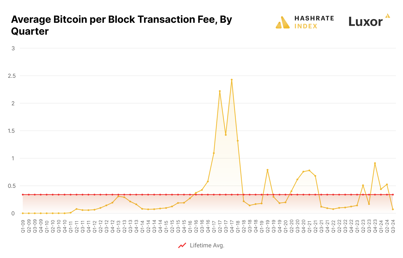 After a period of post-halving volatility, Bitcoin transaction fees hit some pretty shocking lows in Q3 2024. As BRC-20, Ordinals and Runes activity subsided, average transaction fees per block (on a Bitcoin denominated basis) were lower than any quarter since Q2 2014. In fact, Q3 2024’s average fees per block of 0.073 BTC is approximately 80% lower than the lifetime average figure of 0.34 BTC per block since Bitcoin’s inception.