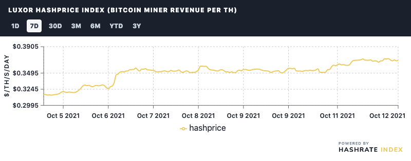 Hashprice: Hashprice is back above $0.35! Thanks to the ongoing bitcoin price pump, mining profitability is up 16.5% over the week to $0.3691/TH.