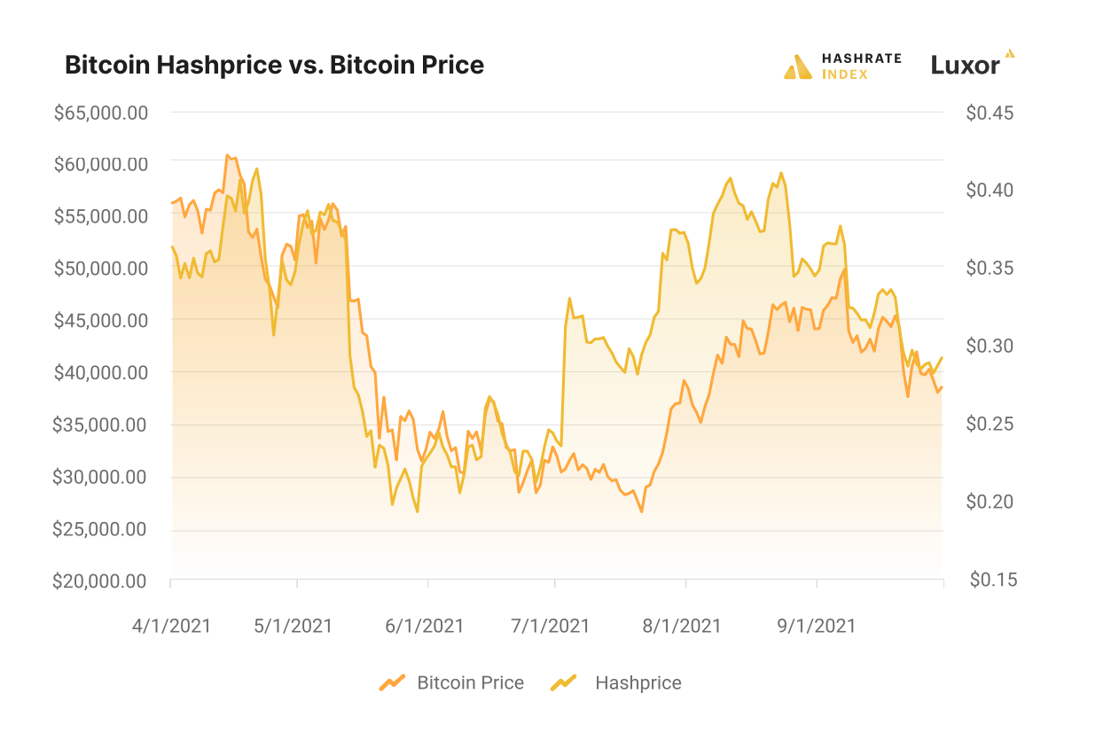 With competition reduced in Q3 and difficulty much lower than pre-ban levels, hashprice in USD more than doubled from its Q2 lows in June to its Q3 highs in August. Hashprice closed out Q3 at $0.29/TH, which was 30% lower than the yearly high set in April. For hashprice in BTC terms, miners saw a 70% increase from the profitability trough in June to its crest in July.