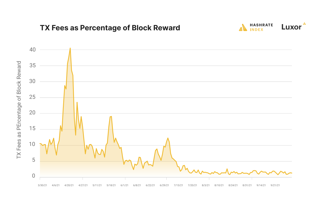 Fees as a percentage of block rewards have plummeted since the event, with the quarterly average for fees as a share of block rewards falling from 11.14% in Q2 to 2.06% in Q3.