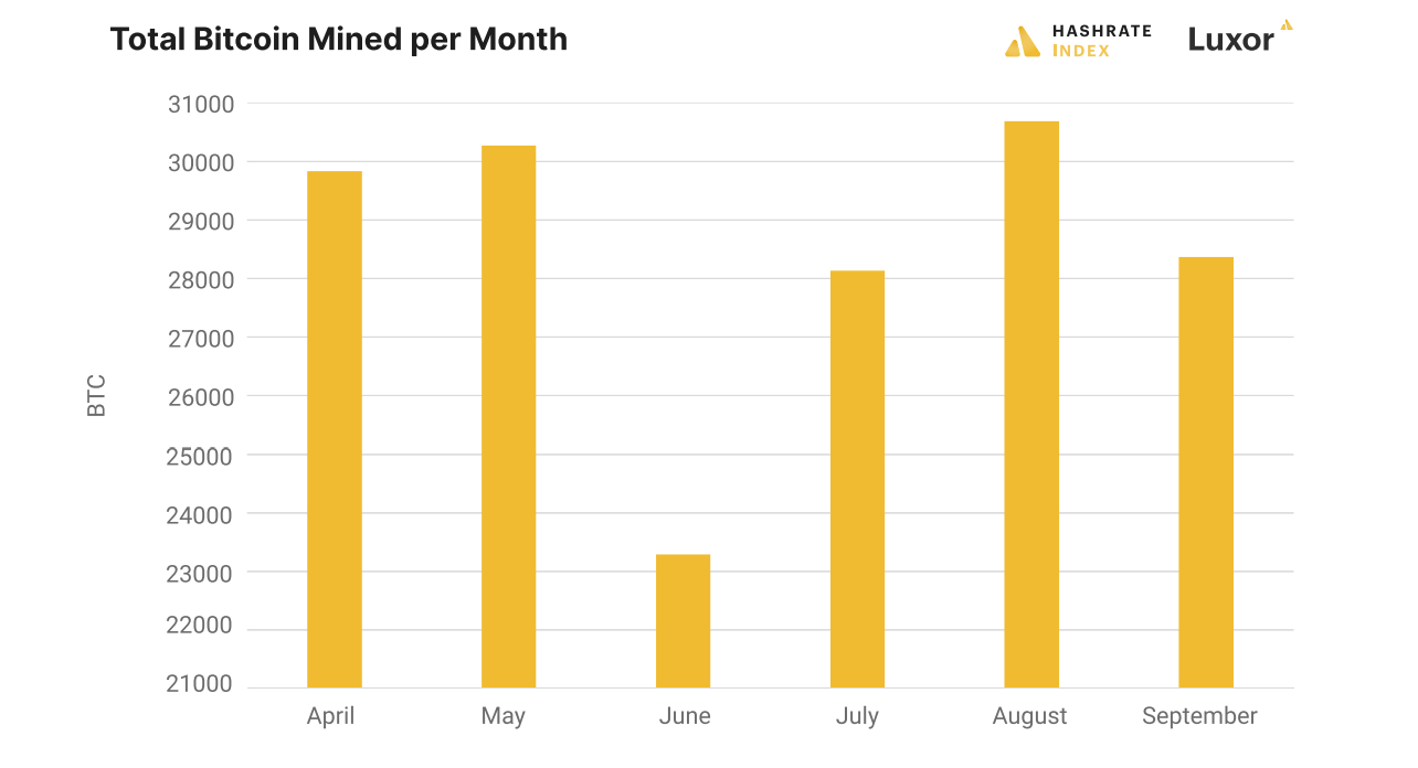 As hashrate began recovering and North American mega-farms booted up fleets of the newest machines, we saw a reversal of this trend in August. With hashrate surging, block production went into overdrive with an average block time of 8.2 minutes, netting them 30,683 BTC.