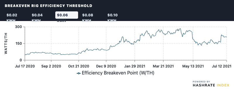 Rig Breakeven Threshold: The difficulty adjustment gave a boost to the breakeven thresholds. Naturally, the threshold for all efficiency buckets is up, and the current breakeven price for a $0.06 kWh setup is 207.77 W/TH.