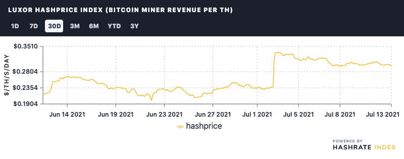 Hashprice: Bitcoin’s hashprice as been staying steadily around or above $0.30/TH since the last difficulty adjustment, though it has been trending slightly downward since its spurt to $0.33 directly following the adjustment. Current hashprice is $0.29.