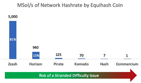 Looking at the Equihash algorithm we do see some risk of Stranded Difficulty. There is over 6,000 MSol/s of Equihash hashrate around the world. The majority is pointed toward Zcash and it exponentially declines from there. The networks with less hashrate inherently have a larger risk of Stranded Difficulty.