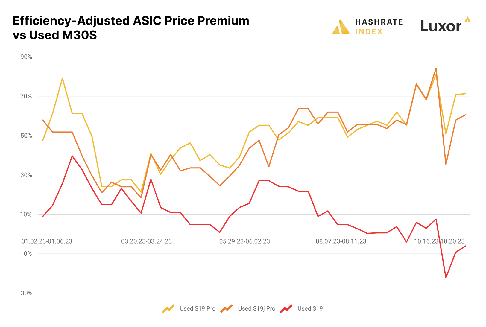 Speaking to this metric’s usefulness when evaluating ASIC miners from the same generation, we can see that a used S19 is significantly undervalued when compared to its new-generation peers, the S19j Pro and S19 Pro.