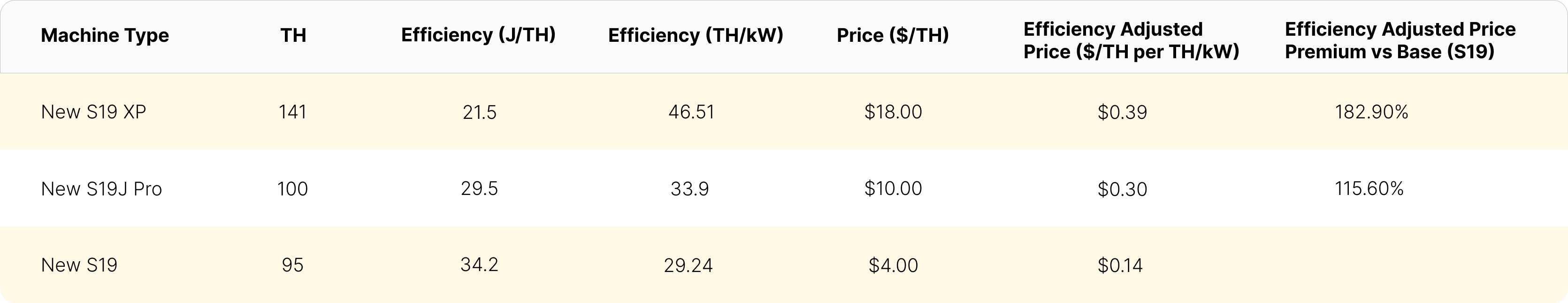 While this metric is important, it fails to directly consider efficiency – a key determinant of an ASIC miner’s economic performance. To provide an obvious example of what is missing by considering only the hashrate-adjusted price, in the table below we assume that the S19j Pro and the S19 XP are listed at the same price per terahash. In terms of the hashrate-adjusted ASIC price ($/TH), both models would be priced at an equivalent 150% premium to the S19. However, since an S19 XP has a better efficiency profile than a S19j Pro, it is clearly a much better purchase. As such, an S19 XP should demand a higher percentage premium on an efficiency adjusted basis when compared to an S19.The typical hashrate-adjusted ASIC price measure misses this completely.