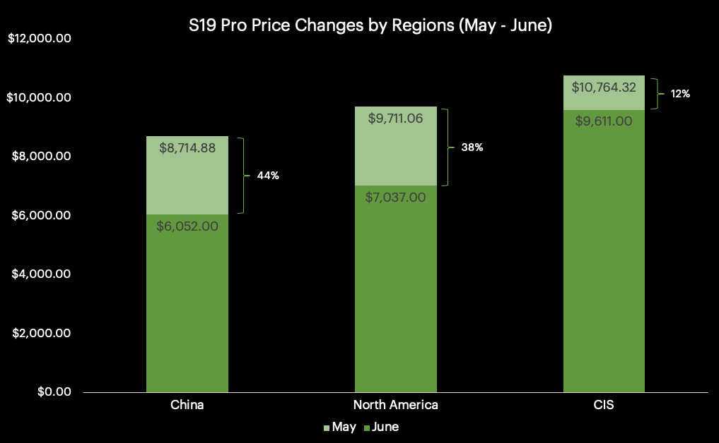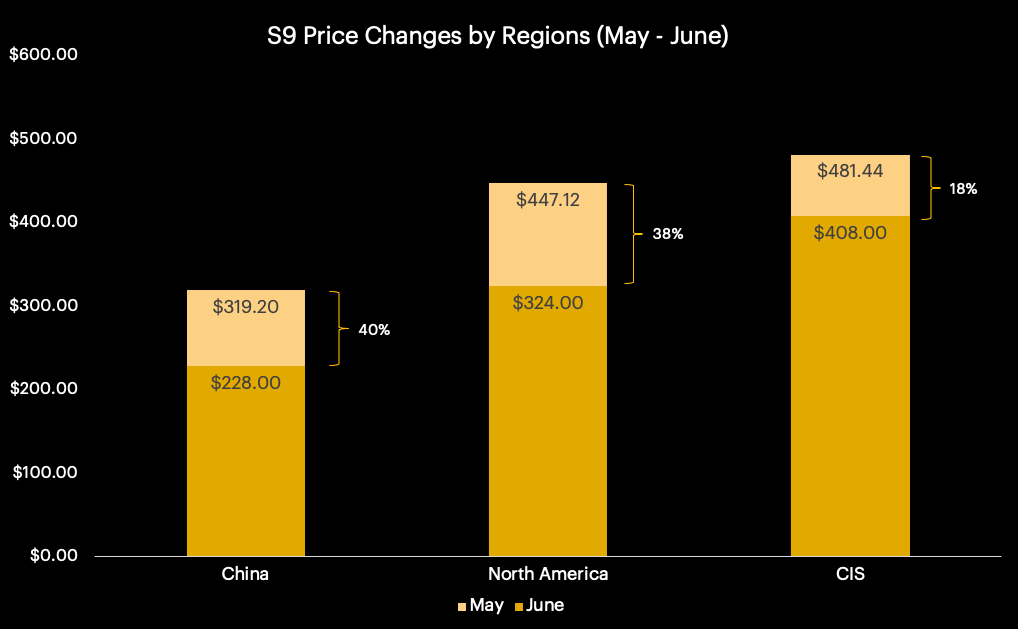 New and old machines alike have fallen steeply in price since the ban, with S9s and S19 Pros seeing roughly 40% discounts in China and the United states from their prices a month ago. Prices in the Commonwealth of Independent States (CIS), which includes Russia, Kazakhstan, Uzbekistan and Ukraine, among other countries, have not seen as drastic a decline, with S9s selling for 18% less and S19 Pros at 12% less than their market values a month ago.