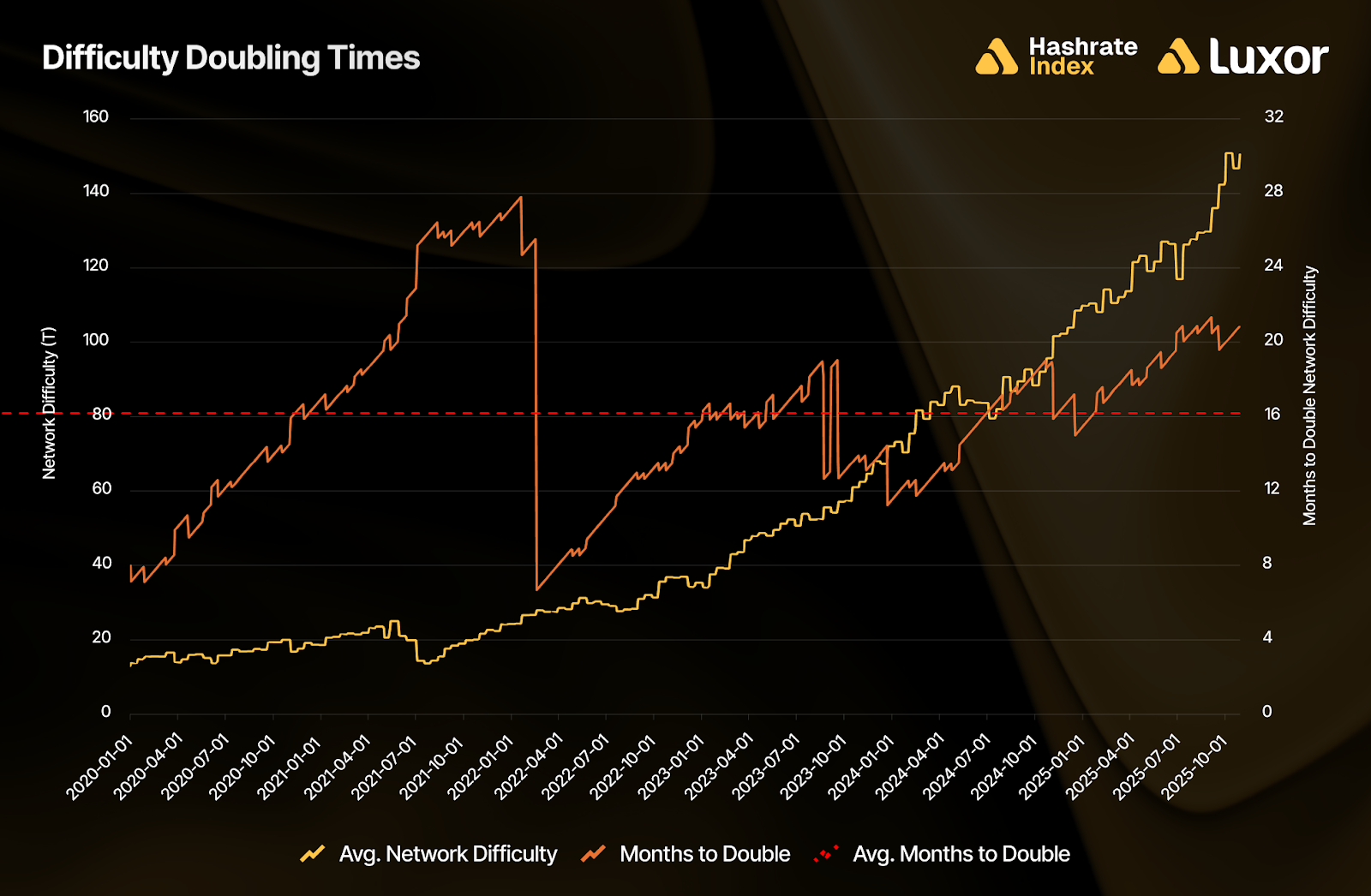 The net effect: roughly every 16 months since 2020, a fixed unit of hashrate earns half as much bitcoin, driven purely by rising network competition.