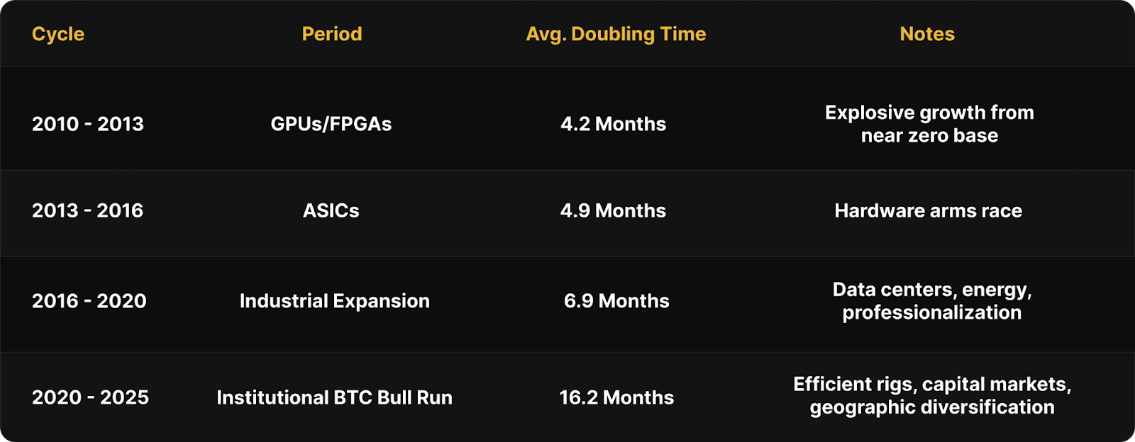 This growth trend has occasionally stalled. Policy shocks such as China’s mining ban, market events like the FTX collapse, and seasonal energy price changes in regions like Texas have each slowed network expansion temporarily. Over the long term however, growth has been exponential, and when network hashrate (i.e., difficulty) doubles, a miner’s BTC-denominated output per unit of compute is effectively halved.