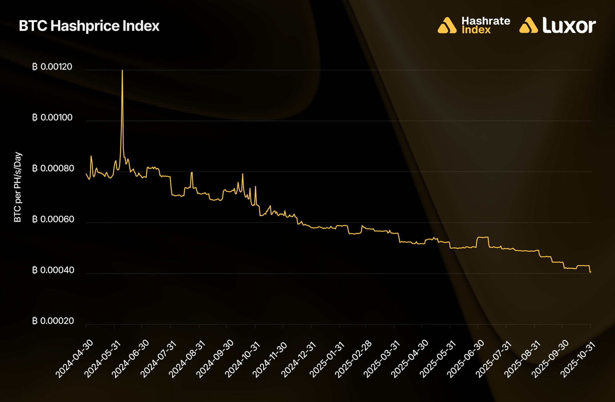 As new-generation hardware joins the network and more hashrate chases the same block reward, network difficulty climbs, cutting BTC-denominated mining revenue per unit of compute. Since the 2024 halving, BTC-denominated Hashprice has already been sliced in half* from roughly 0.0008 to 0.0004 BTC per PH/s/day.