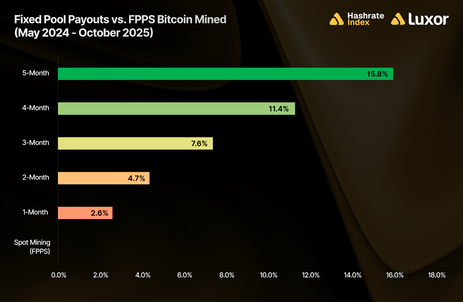 The numbers speak for themselves: Luxor’s fixed pool payouts have meaningfully outperformed spot mining (FPPS) since the 2024 halving, led by 5-month (+15.8%) and 4-month forward sales (+11.4%). These longer contracts captured value by locking in prices ahead of rising difficulty and a low-fee environment, while still preserving BTC exposure.